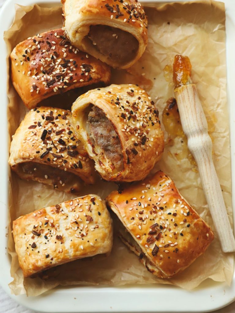 Golden puff pastry wrapped around juicy sausage meat and glazed with a sweet and tangy hint of marmalade for mouthwatering balance of savoury and citrus, they can also be made vegan using plant-based alternatives.