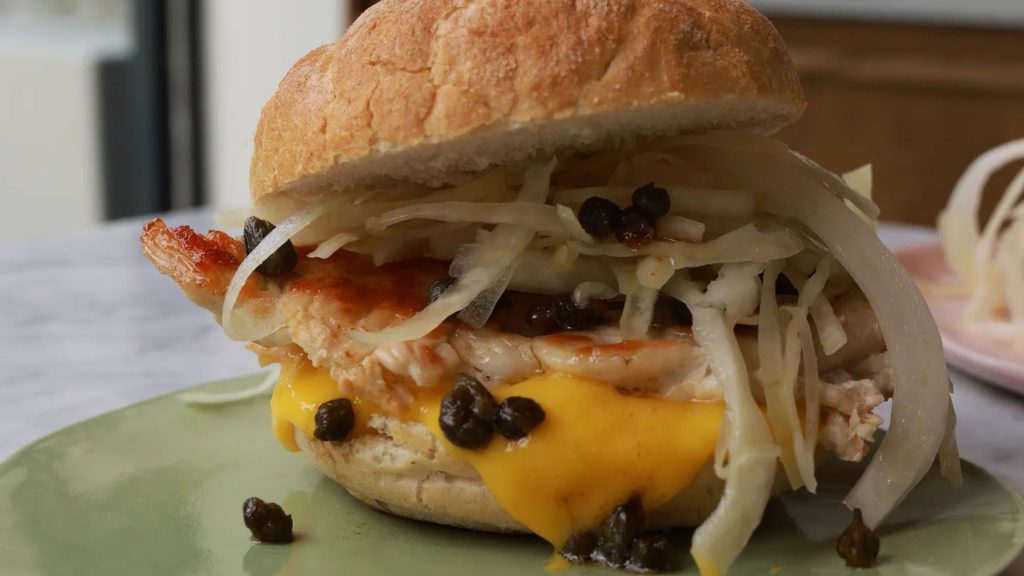 “Using the French paillard technique, you gently pound the chicken breasts until thin, helping them cook in minutes while making the meat go further. The brown butter and crispy capers add a nutty, salty richness, balanced by a crunchy slaw and vibrant mango dressing. Serve with crusty while rolls and mayonnaise.”