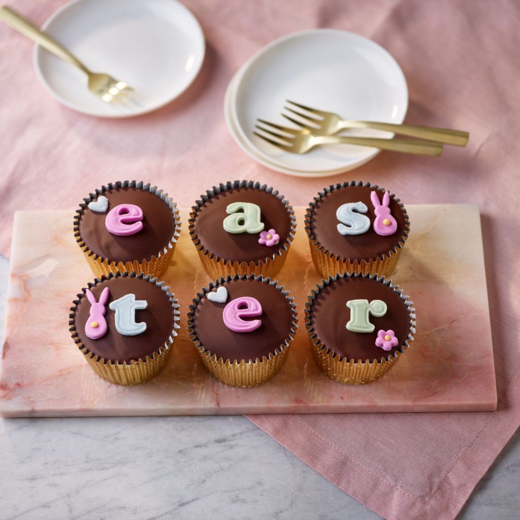 How adorable are these? These six chocolate sponge cakes are topped with chocolate fondant icing and then hand decorated with sugar paste and royal icing for a bold and beautiful addition to any Easter table.