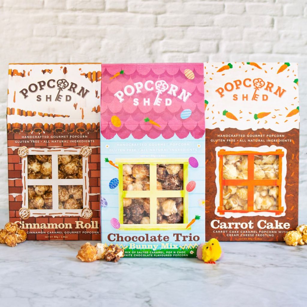 Ready to add some POP to your Easter HOP? This popcorn trio is sure to put a spring in your step. What are the flavours? Salted caramel, milk and white chocolate; carrot cake, caramel and cream cheese frosting; and spiced cinnamon and caramel.