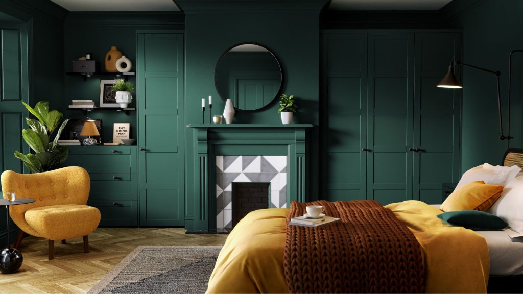 Search interest in moody interiors continues to soar, but 2026’s dark palette is softer, warmer, and more textural. Deep greens, navy, charcoal, and black tones paired with matte finishes, gold highlights, and warm lighting create inviting rather than dramatic spaces. In kitchens, dark units are softened by natural stone or warm wood accents, while in bedrooms, think rich dark woods such as a black walnut matt finish. Plush textiles, layered throws, and dimmable lighting also create a retreat perfect for year-round sophistication. “Dark spaces have shifted from bold to soothing,” says David. “What people love now is a cocooning feeling: cosy, intimate, and incredibly luxurious.”