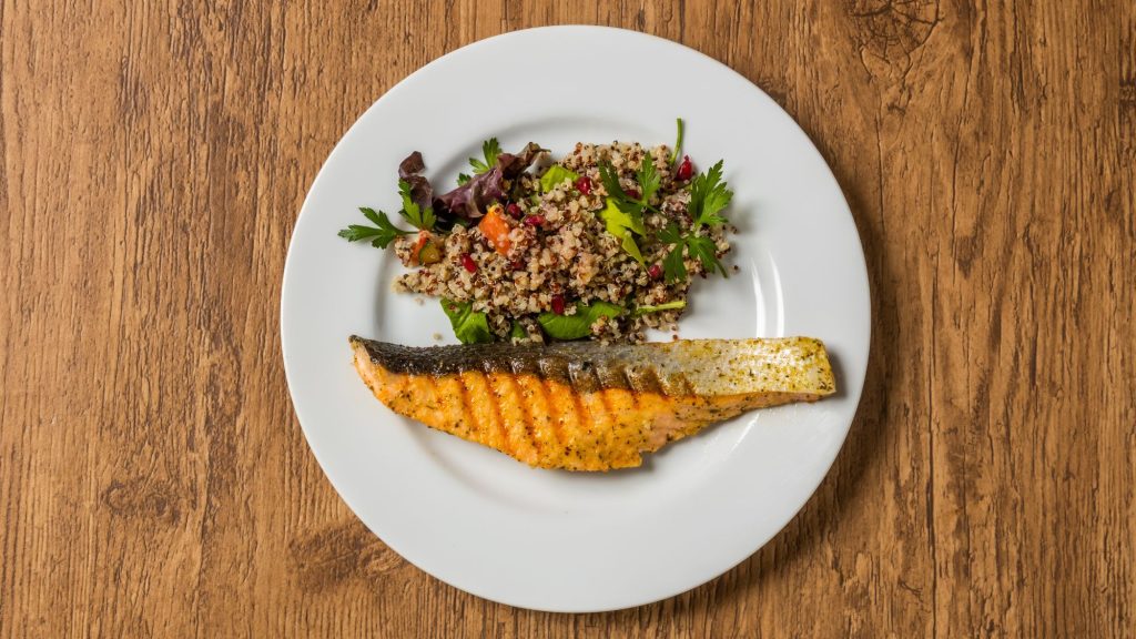 Within an hour, aim for a meal that includes protein ad slow-releasing carbs. This combination supports muscle recovery and keeps blood-sugar stable. Think: grilled salmon, quinoa, and greens.