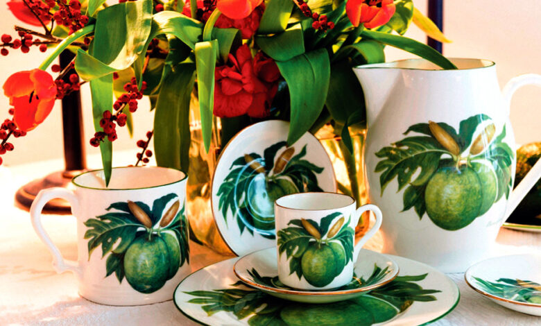 Jenny Mein Designs is an exquisite British tableware brand founded by Jenny Mein, an artist and designer who creates pretty and elegant bone china tableware. Her range is inspired by her memories of the fruit and flowers in her beautiful childhood family garden on an old sugar estate in Jamaica. The china is produced exclusively under patent using traditional methods in Stoke-on-Trent, England, home of the British china industry.